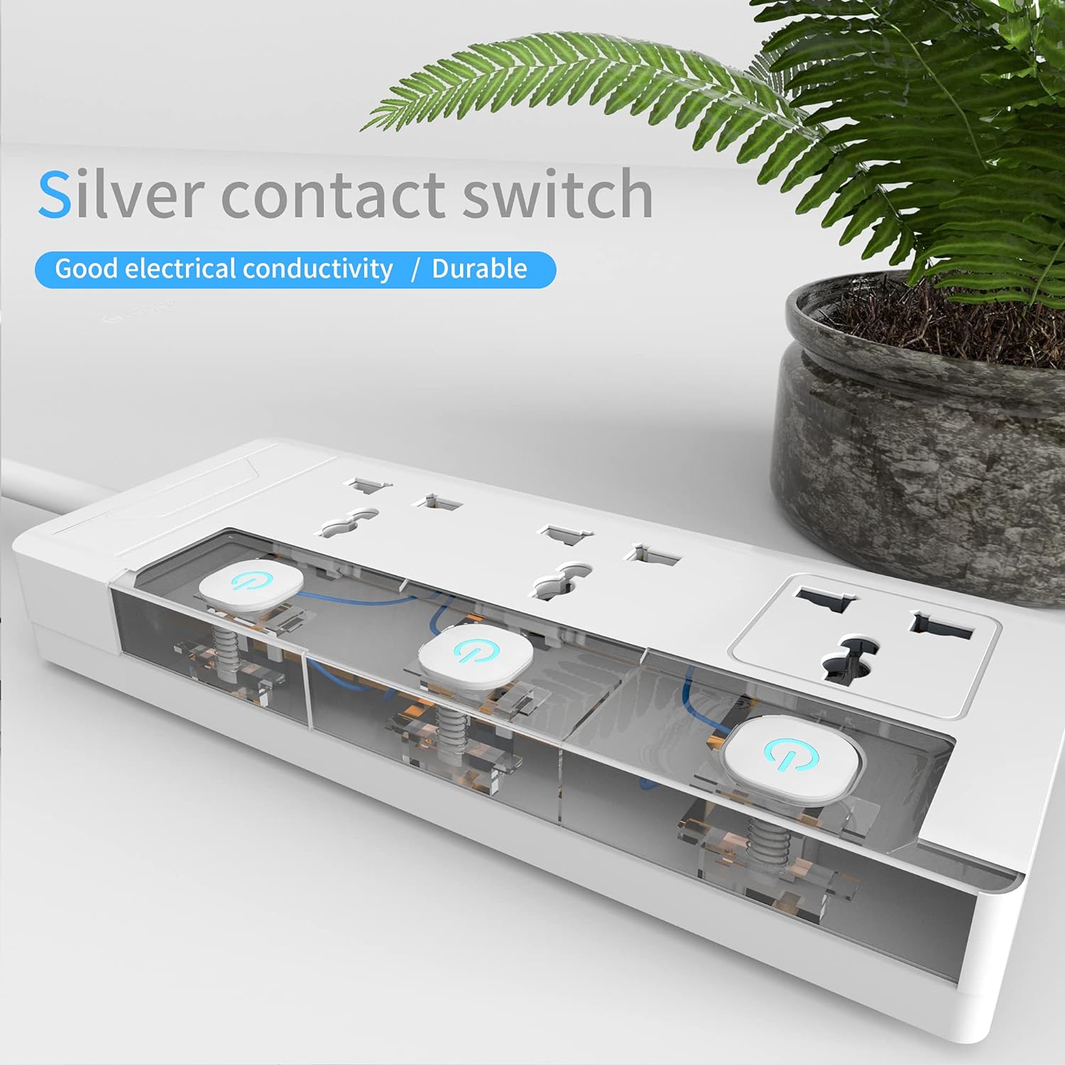 10 ampere, 2500 watt rating; 100% pure brass bar inside; no wiring reduces risk of short-circuit; in-built LED switch.