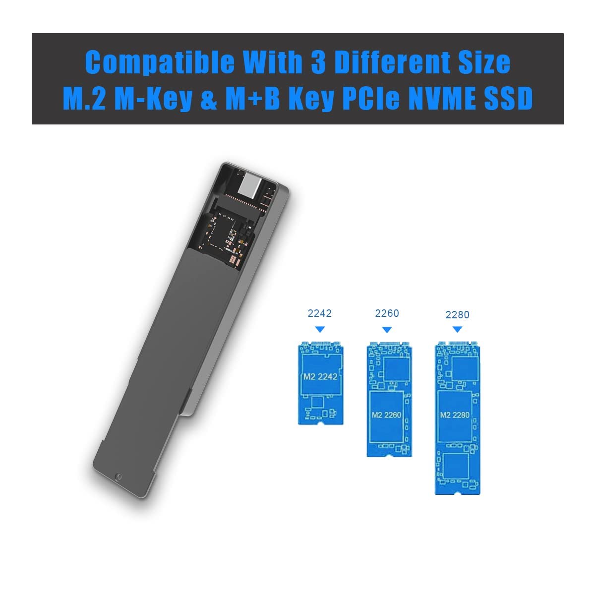 This enclosure supports M-Key and M+B Key PCIe SSDs in the popular 2242, 2260, and 2280 form factors, providing versatility for a wide range of SSD models. Additionally, it is compatible with both NVMe and NGFF protocols, enabling seamless integration with various SSD types.
